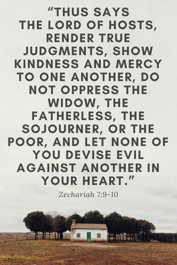 “This is what the Lord Almighty says: administer true justice, show mercy and compassion to one another, do not oppress the widow or the fatherless, the alien or the poor. In your hearts do not think evil of each other.”